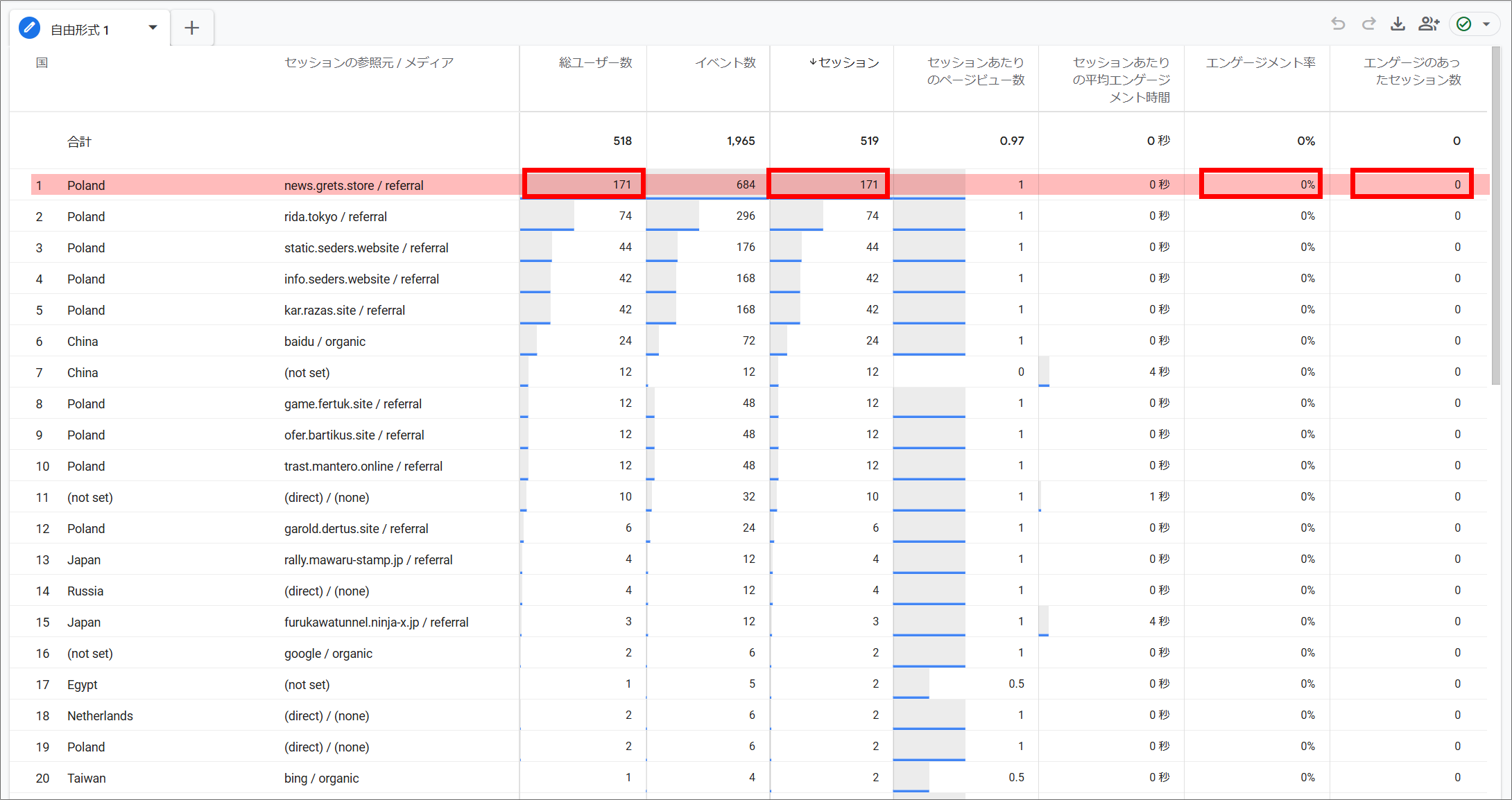 すると、国には外国名、参照元 / メディアには見たことのない参照元が referral で、そしてどのデータもエンゲージメントが0で計測されていました。