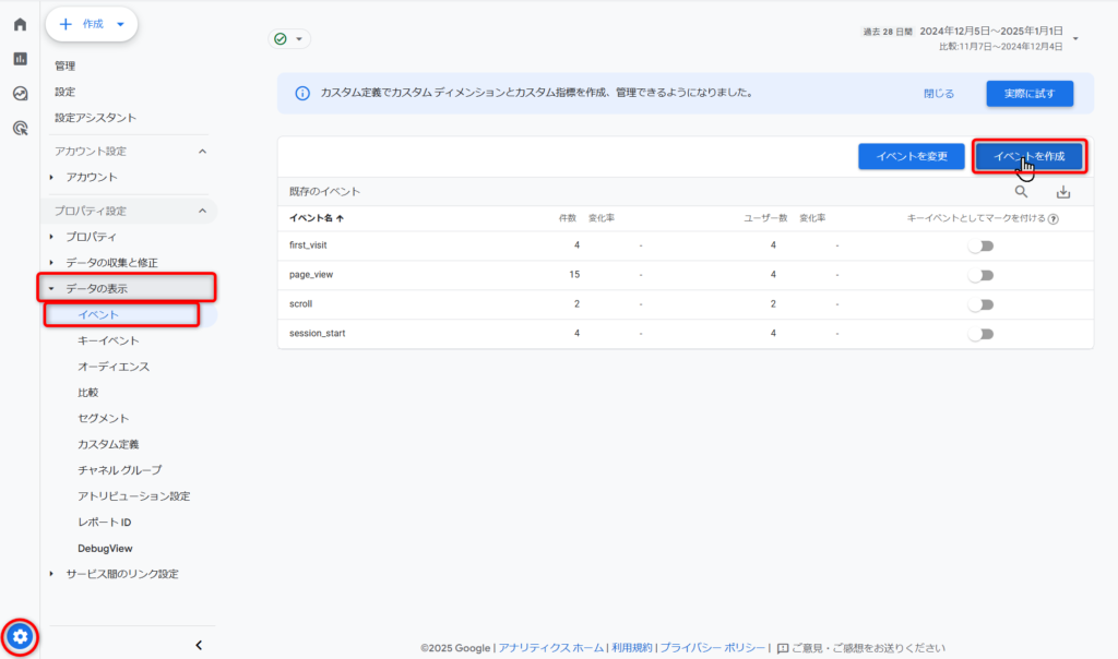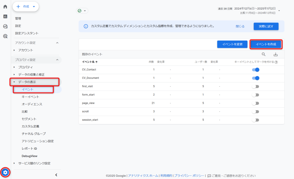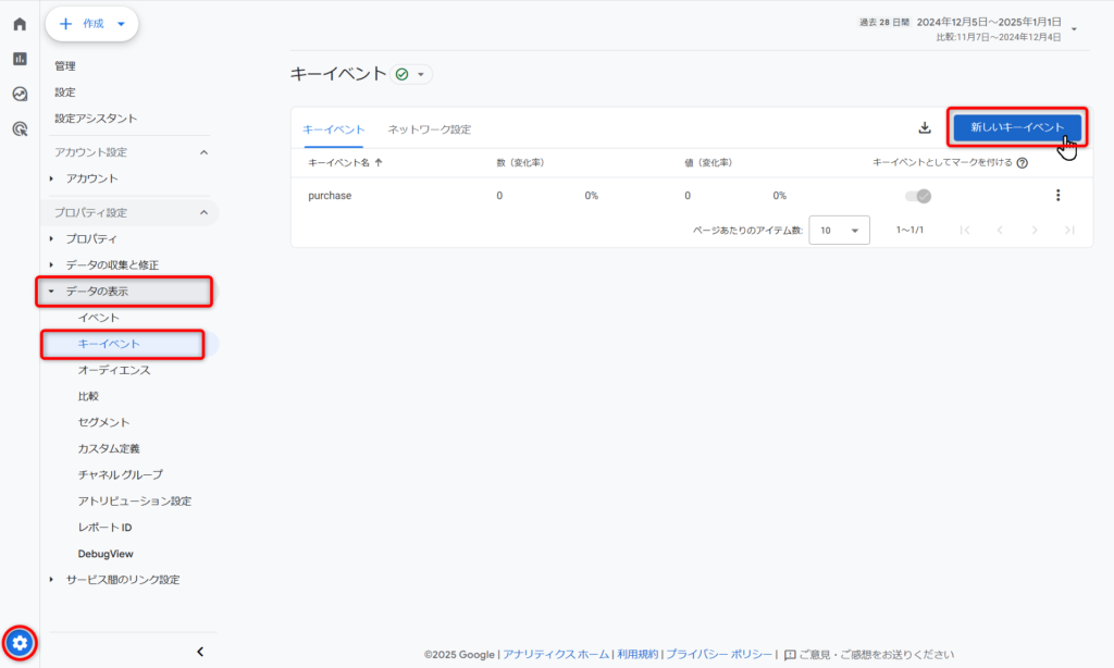 左下にある青い車輪マークの「管理」から「データの表示」→「キーイベント」をたどり、『新しいキーイベント』をクリック。