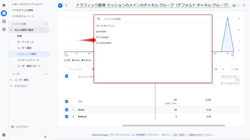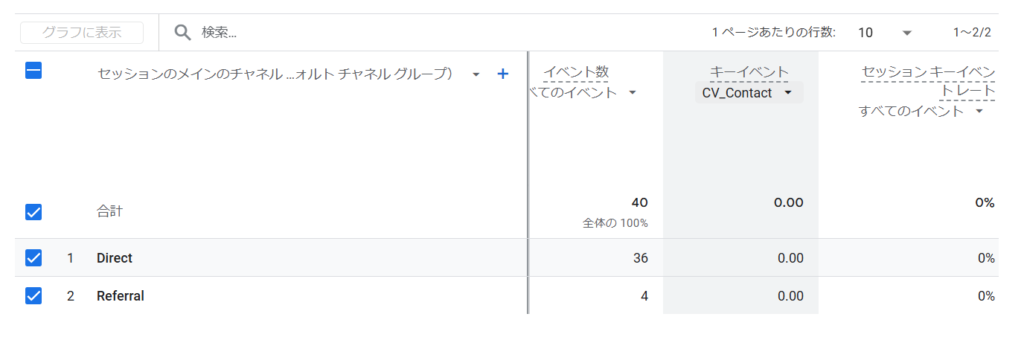 CV_Contact、お問い合わせ数として作成したキーイベントが表示されています。