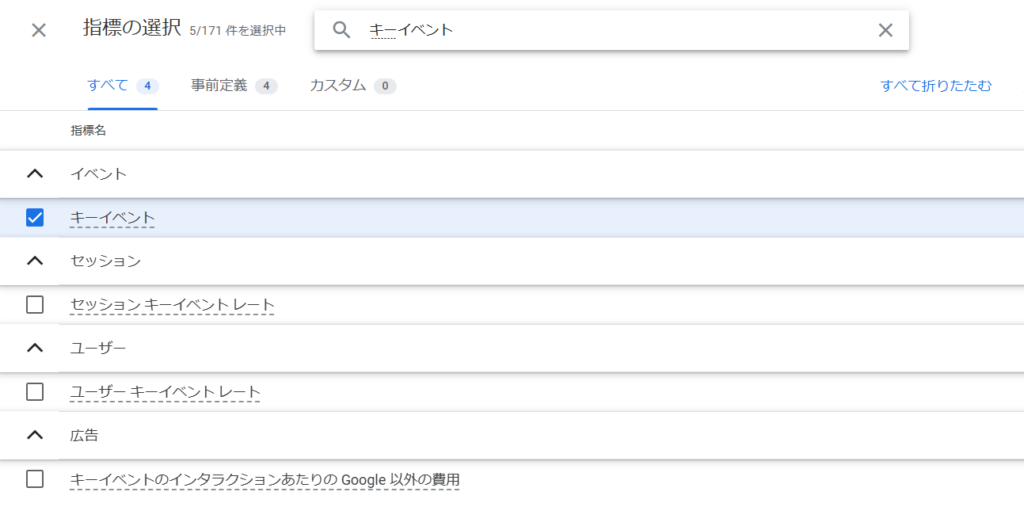 指標の追加から指標を検索しても「キーイベント」しか存在しません。このキーイベントの下に作成したキーイベントがサブメニューとして表示されてよさそうなものなのですが・・・