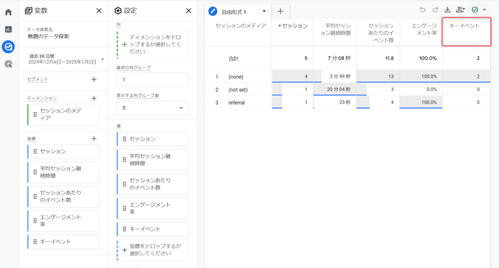 探索の自由形式、テーブルで表示させています。ご覧のように「キーイベント」だけで標準レポートのようにプルダウンメニューからキーイベントの選択もできません。