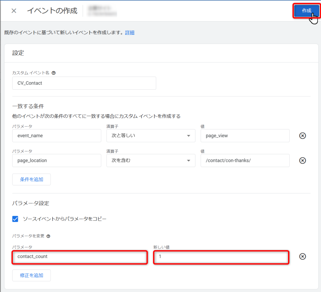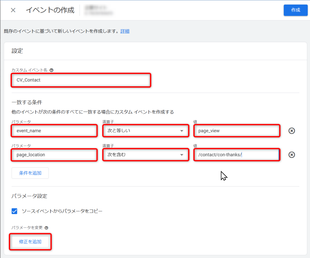 解説すると、page_viewイベントかつ、ページのURLがお問い合わせ完了ページのときにイベント発生するという設定です。わからないときはそのまま入力されてください。
