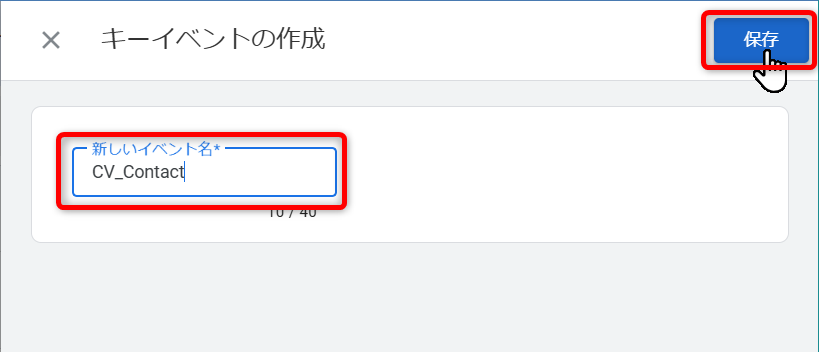 「新しいイベント名」に、①イベント作成のカスタムイベント名に設定した名称を入力し、保存をクリックします。