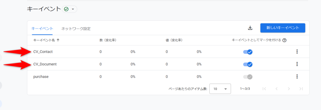 作成されたキーイベントが表示されます。もう一つのキーイベント、資料請求を CV_Document として作成しています。