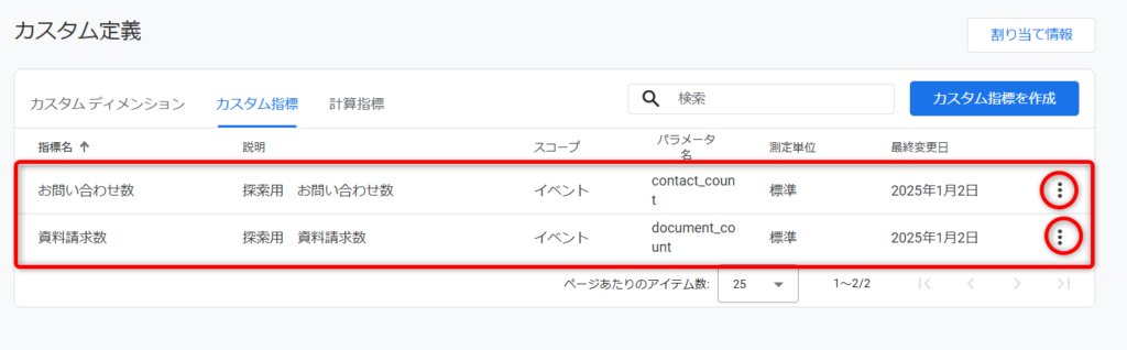 作成したカスタム指標に修正が必要な際は、右側の赤丸で囲んでいる点々をクリックすることでカスタム指標作成の画面が表示されます。