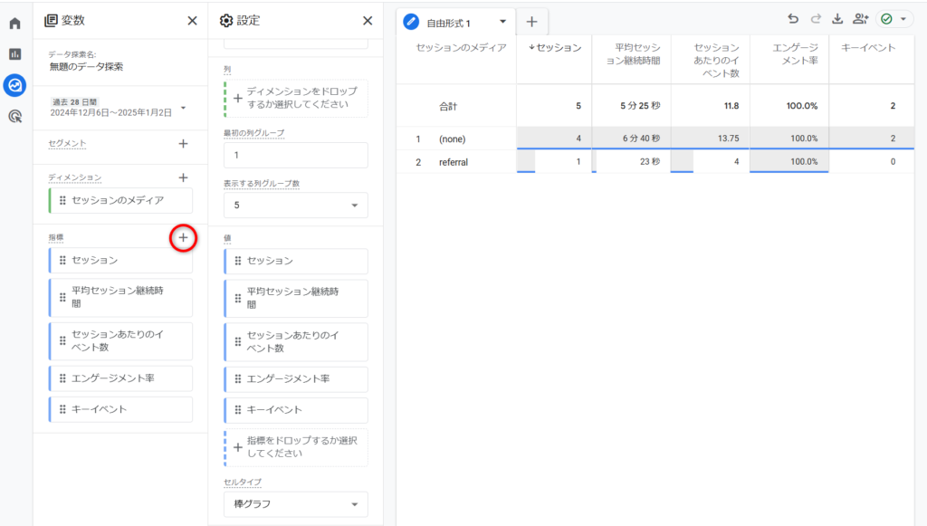 探索→空白から自由形式テーブルで確認します。指標欄の「+」をクリックし指標を追加します。