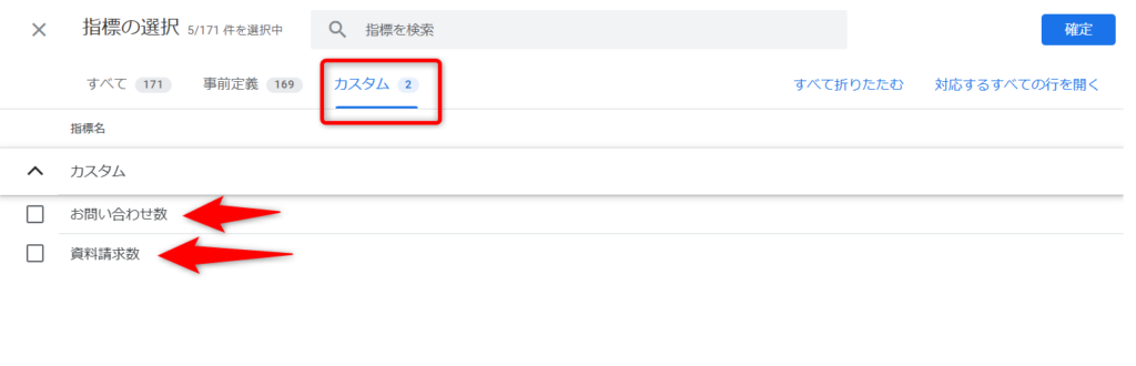 カスタムを開くと、カスタム指標作成で作成した「指標名」が表示されています。これらにチェックを入れて「確定」をクリックします。