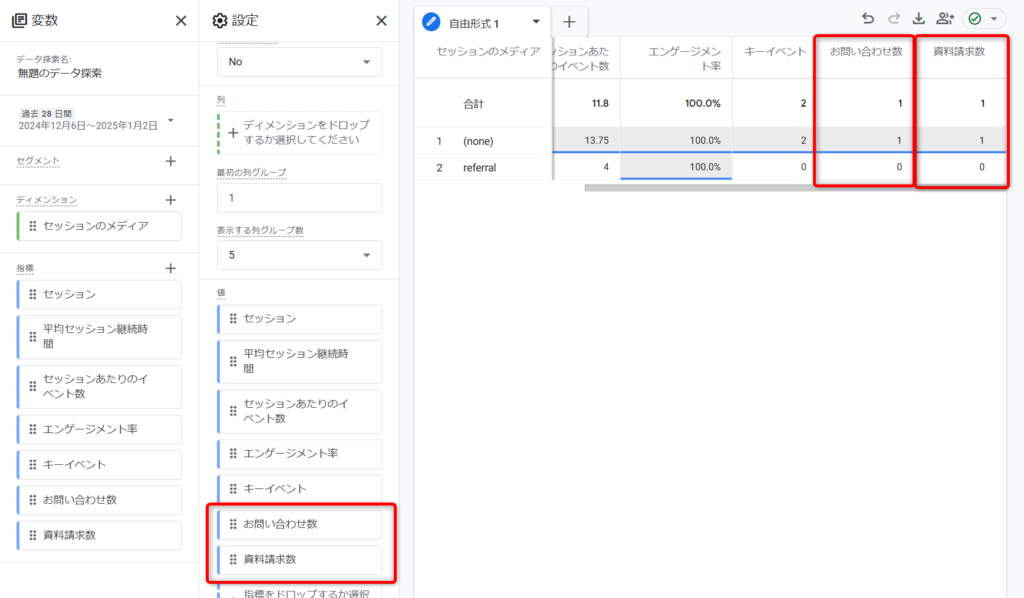 テーブルにお問い合わせ数と資料請求数が表示されました。キーイベントで設定した値を、カスタム指標を追加することで標準レポートにはできない横並びでの表示ができるようになりました。