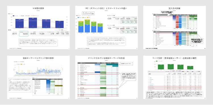 アクセス解析を実施し、レポートを作成いたします。レポートはA4横で作成しPDFでお渡しできるようにします。