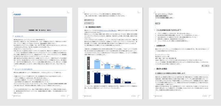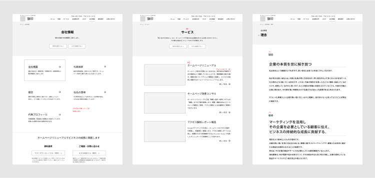 できあがった原稿を基に、メッセージ・画像(写真やイラスト)・文章をページ毎にどう配置するのかを決める、「ワイヤーフレーム」の制作工程です。リニューアルのイメージがここでグッと掴めるようになります。 企業のホームページは社名で検索されトップページから流入されることが多いです。見込み客は会社に興味を持ち社名検索でホームページに流入してもすぐに「問い合わせ」というアクションをしてくれません。企業と商品をしっかりと吟味します。 見込み客がホームページ内でストレスがないよう必要な情報をわかりやすく配置しホームページ内を動き回りやすくします。 多くの場合、見込み客は一度目の訪問で問い合わせをするのではなく、再度訪問して検討した上で問い合わせをする傾向にあります。その時、すぐに問い合わせしてもらえるようトップページの一画面目に問い合わせボタンを設置します。 昨今の企業向けホームページのレイアウトが一様にそうなっているのは、そういった理由があるからです。見込み客の態度変容に添ったホームページ内の動線設計が重要となります。 そういった見込み客の動きを想定し、動きにあったレイアウト設計を一つひとつ説明させていただき、依頼主さまに納得してもらいながら進めていきます。