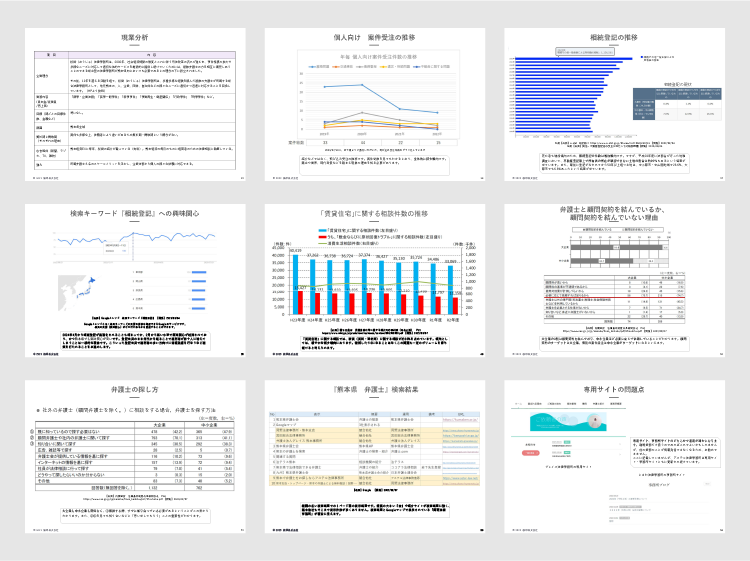 ワークショップで得られた結果を基に、下記内容のマーケティング戦略のご提案をいたします。詳しくは、上記選ばれる理由の『02確度の高いマーケティング戦略をご提案します』をご覧ください。 顧客インサイトシートを全く回収できなかった場合、ヒアリングさせていただいた顧客像とインターネット上のデータにより下記項目を導き出し戦略立案いたします。 理念につきましては、選ばれる理由『01依頼主さまの事業を立体的に理解します』にあるように、ご要望があれば提案いたします。 依頼主さま企業の理念、強み、真の顧客像、その顧客像に対する呼びかけの文章(コピー)、そしてホームページまでの流入経路設計、そして顧客を説得するためにどういったページが必要になるかというページ構成までを設計します。ページ構成を俯瞰した図で、サイトマップと呼びます。ここまでを戦略立案いたします。