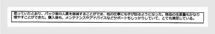 また、野菜包装機を利用した感想で『人員削減』というキーワードがでてきました。このキーワードをベネフィットとしてキャッチコピーに取り入れました。顧客が仰っていることですので、ストレートでわかりやすくパワフルなコピーとなりました。