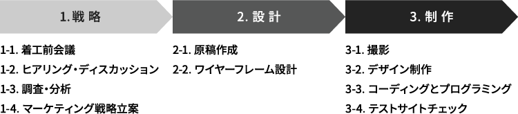 リニューアル工程は、戦略・設計・制作の3つの工程に分かれていて、約半年ほどを掛けて進めて行きます。